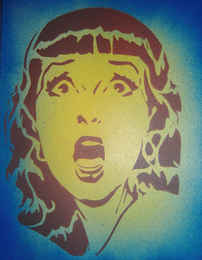 Frank Sinatra. Got the design from a free site. There is a glare on it but the blue part is slightly metallic. Used a shimmer texture semi-transparent black paint and then added deep blue over it. I love the way it looks and love the design. The stencil ripped all to hell when I was peeling it off so that sucks. For some reason my spray adhesive is sticking way stickier than ever lately and it's been a problem.Spray paint on acrylic art paper.