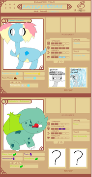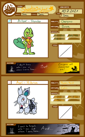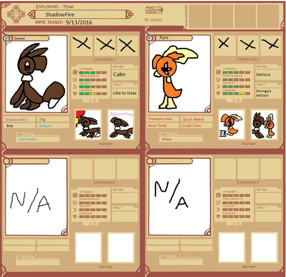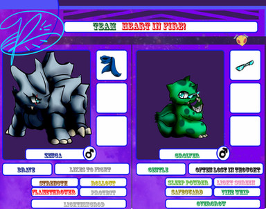 Team two (possible switch seems more interesting then my other team) backstory timeWilde was trained as a child to fight to be the best fighter, after learning everything he can from his father he left home hoping to learn other styles and become a better fighter he happened upon a town seething with dark pokemon that's when he found the underground fighting matches watching these pokemon fighting dirty disgusted him so he joined in just to show them true fighting he beat everyone except a scraggy with a slash across his face after hours of fighting it ended in a draw, the scraggy introduced himself as Cillian born on the streets on his own he took up fighting to get money but got addicted to the fighting Cillian follows Wilde now hoping to get stronger and become the strongest pokemon ever still not used to people he still has the foul mouth and dirty fighting technique of street fighting