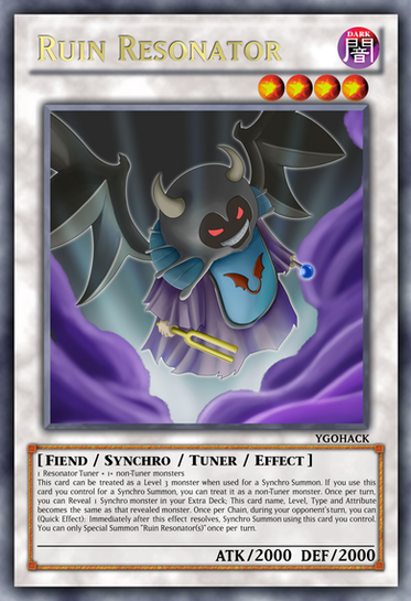 If you control 2 or more Synchro monsters you can Special Summon this card from your GY. Once per turn, you can send 1 Resonator monster from your hand to the GY: Reveal 1 Synchro monster in your Extra Deck. This turn, this card name, type and attribute becomes the same as the revealed monster. You can use each effect of “Ruin Resonator” once per turn. A Synchro monster that uses this card as Synchro material cannot be destroyed by a card effect.