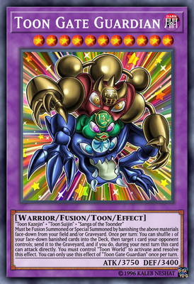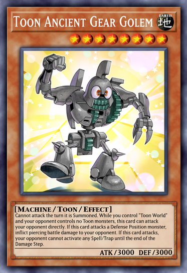 Cannot attack the turn it is Summoned. Cannot be Normal Summoned/Set. Must be Special Summoned (From your hand) by tributing 3 Level 7 or higher “Toon” monsters with different names you control. While you control "Toon World" and your opponent controls no Toon monsters, this card can attack your opponent directly. Once per turn, when a “Toon” card you control is targeted for an attack or a card effect you can negate the attack or effect.