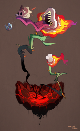That said, already a hats off to someone like yourselfΒ hakkasm Β on drawing this amazing beast of a picture!Β Love this boss battle just because it's a burning plant inside a damn volcano that you're fighting!Β Even with the way you take into account of the characters, the angle and even the intensity of the flames, is stunning beyond words!