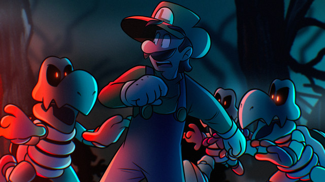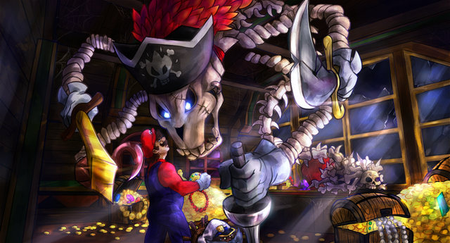 The coloring is chilling and ghostly, I love the cool blue prevalent throughout the whole picture from the groups of Embers floating in the background, the spooky mist gathered along the floor, Cortez's glowing eyes, and even the red from his scarf and Mario himself having a more purplish hue than a vibrant red (the blue highlights and lighting makes this really feel like it's taking place on a haunted ghost ship <333); your shading is also very clean and smooth (really love how you did the lighting on Cortez's face and his swords! ) with a very nice attention to detail to the flames flickering off of his minions, the cracks and visible wear-and-tear on his weapons, and how the lighting illuminates the little groves and depressions on his skull and vertebrae~