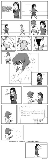 Inspired by that crack pairing meme I filled out not too long ago. I really liked the impending desk sex theme, so I decided to take it a bit further. Of course, I will never be able to watch 2nd GIG the same way again, but sacrifices must be made in the name of glorious crack yuri pairings ^_^The physics of this picture were a lot more complicated than I anticipated, which is probably why I've been working on this for the last week. On one hand, you just have to have the Major as the seme, 'cause she's the Major. On the other hand, she must weigh a ton due to all of the reinforcement and what have you, and the size of her body indicates that she'd be really dense as a result of packing all of that mass into such a small container, so I had to come up with a pose where she wouldn't be putting too much weight on Kayabuki's delicate human spine, but where they were both up against a desk. I think I did okay in the end, although it still looks a bit awkward to me for some reason. Maybe it's just the fact that I still can't draw hands