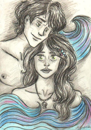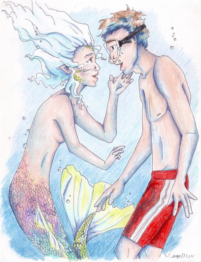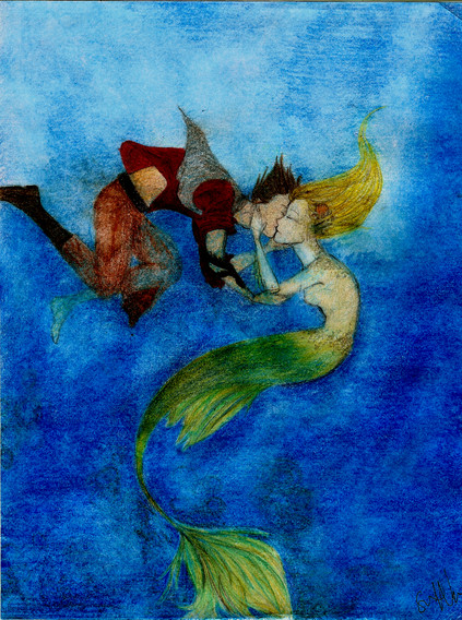 Oh look, more mermaids! Okay, last one, I promise. Some random dude and a fish lady. Looking rather surprised. Yes. Anyway.Prismacolor markers, micron, colored pencil, and some white designer paint on bristol. Rush job, could have come out better, but I was really just doing this as a speedy coloring job.