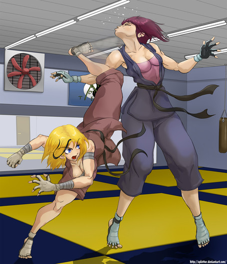 I love the attackers pose^^ Simply cool. The head of the woman who get's hit may be a bit bigger, I am not sure. BUt this is simply a cool fighting scene.