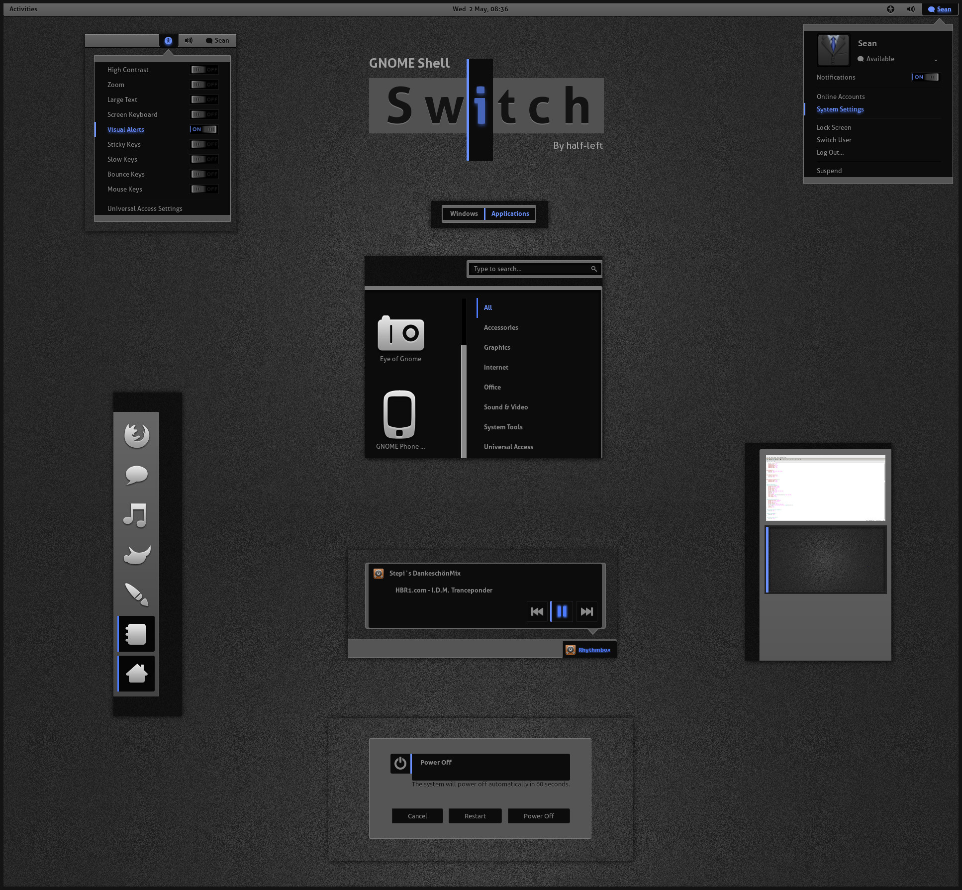 The only things I noticed was that, and the log out/shutdown dialogs. Screenshot here: [link] The shutdown one looks a bit weird with the black square to the side, and the log out one isn't as bad, but just a little odd with the black line to the left of the user-image.
