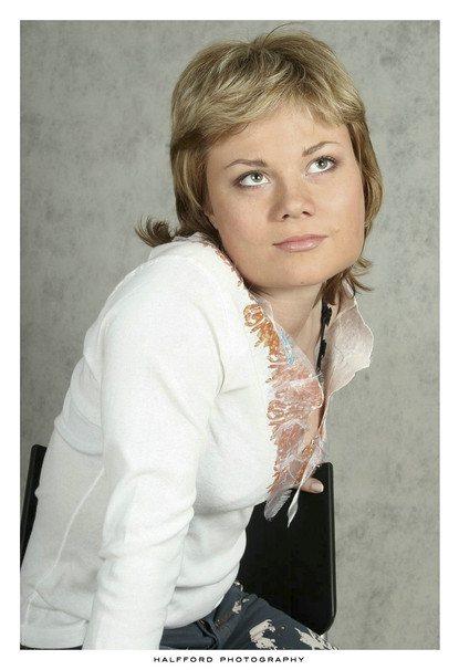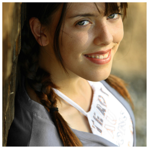She has such pretty eyes. Between the disarming smile and the nipple just peeking around the corner this shot is both endearing and sexy. Very nice.