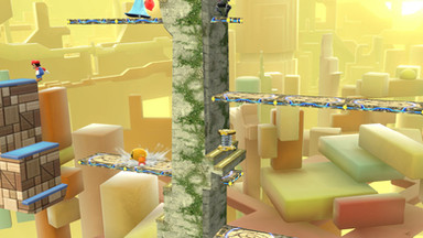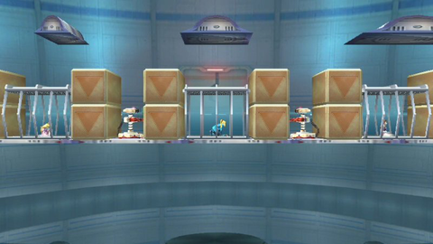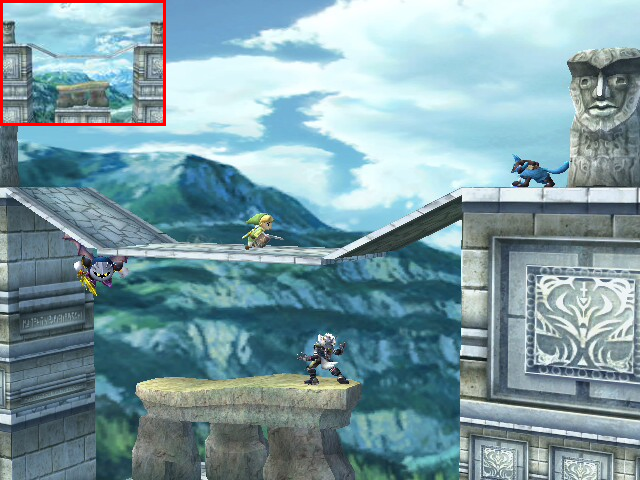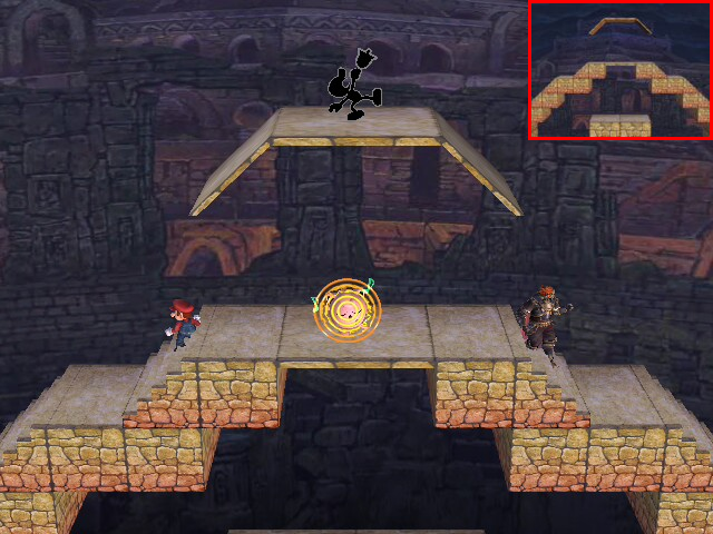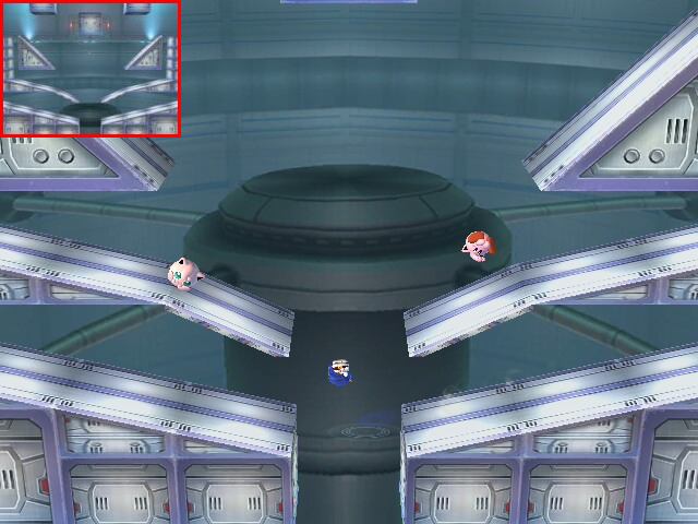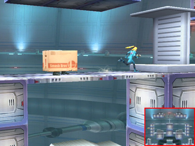 A stage that was built to be navigated! It consists of several square-shaped passageways that all connect together. Since it forms a box, you need to aim your KOs for whatever wall opening happens to be nearest. The skylights in the ceiling are always a good bet. The outer walls have two gaps each, but are divided in the middle. The bottom floor has no openings to the pit, but you can pass through the floor in several places. You have to be careful using down moves when there. Characters with wall kicks are a lot of fun here. The elevators help out those who can't. If you like to run around, this is the stage for you.