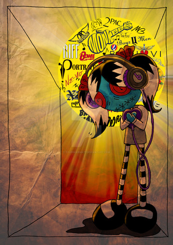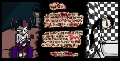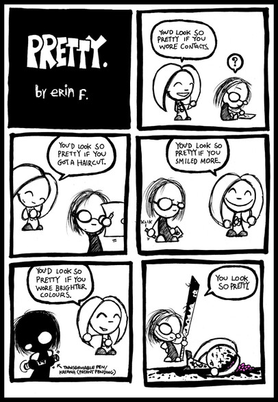 i'm proud of the fact i inked all the letterings with a brush. i know it looks a bit wonky, but still... brush.i feel like i should give credit to Jhonen Vasquez for the second panel, because that lookin-down-a-staircase thing is so his from like a zillion comics he did. but shush, i couldn't think of anything else.