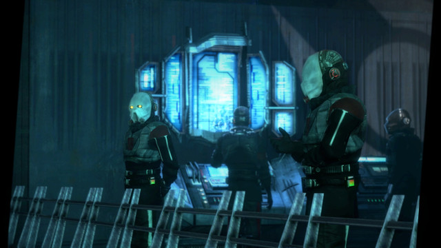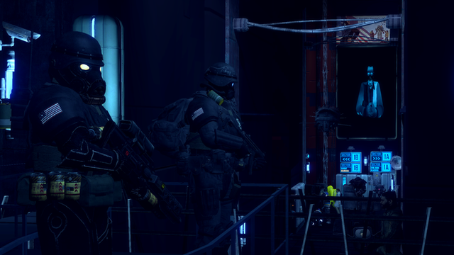 Delta Team moved towards the entrance of the facility. Since the facility entrance was protected by an overhang, the team deactivated their camouflage without the fear of detection.
