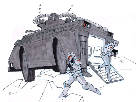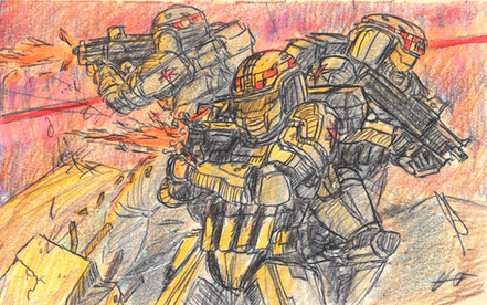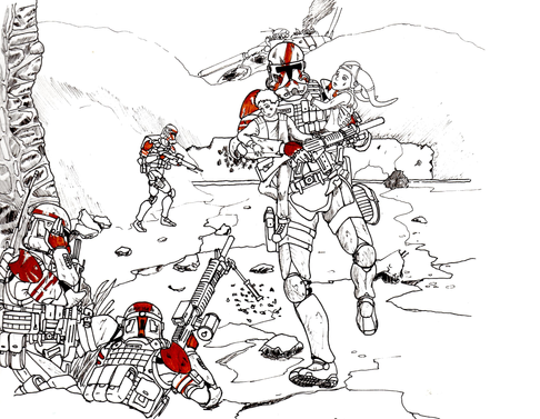 Started out as pose practice for what was going to be a Gears of War pic but I drew clones out of habit. So you get a look at Lett, the trooper they're holding a funeral for in the Into the Manda picture. Also, the jumping trooper isn't supposed to look like he's just lounging in mid-air. Blegh