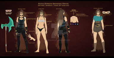 Born to a low-class farming family, Jora is the eldest child by three years, with a younger brother and sister. She was married young (around 16) to a travelling merchant named Duncan. They were travelling to his home town when he fell ill, requiring her to care for him for months. This took its toll on her, and she eventually became ill and depressed herself. When Duncan was well again, he became bored with her melancholy and left her for another woman. Jora didn't know what to do on her own, and was about to buy passage on a ship to take her home when the assassins found her. They made her well again, trained her, and helped her get revenge on Duncan. However, she had too much of a conscience to be the killer they wanted, and she eventually left them to become a freelance assassin/mercenary in a different city (not returning home for fear that it would put her family in danger).