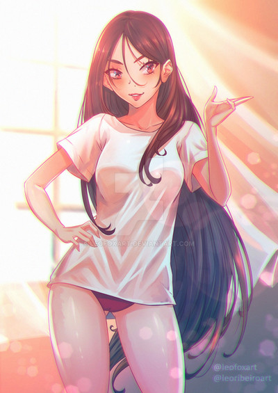 She is beautifully drawn, has such an adorable face, and her lovely physique is quite shapely and athletic in appearance. Her thighs are most impressive, and I like how her wearing a t-shirt draws attention to her legs.