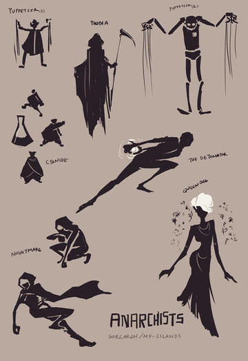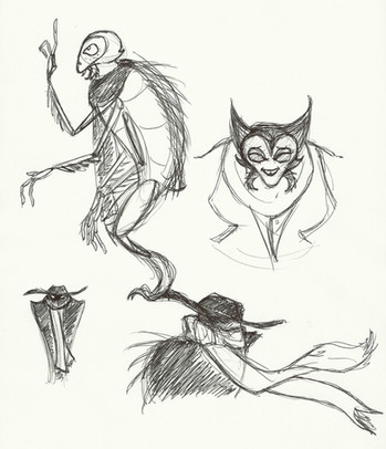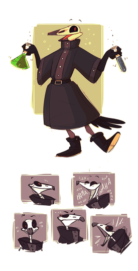 hollow knight/dishonored crossover sketch dump lets GOvarious moth corvos, and jessamine. post assassination corvo has Stress Fluff, but when hes in a more stable state it lies fairly flat on his body like a birds feathers