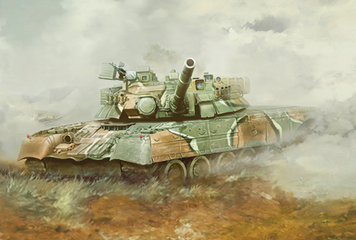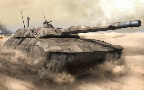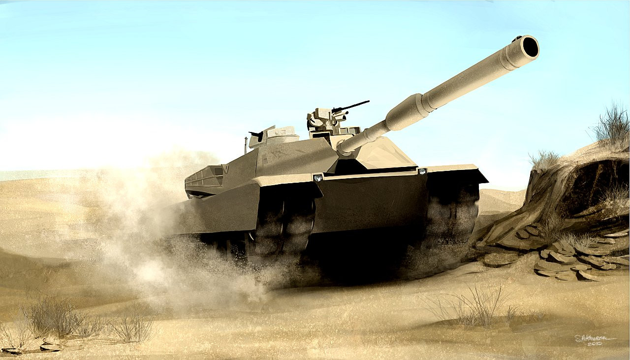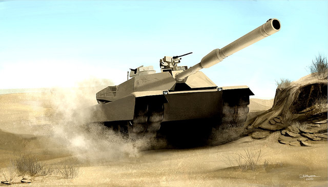 But there's inspiration from a lot of state of the art in tank design. The additional soft-kill grenades (on top of the regular Abrams type smoke-grenade launcher) are clearly from the T-14 Armata. The commander's sight (the thing to its left, opposite the heavy machine gun remote weapon station on the roof) looks like the one used by the K2 Black Panther. The Challenger like features include the extra front armor and the sight on top of the main gun.