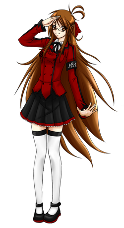 Anke is the human form of a Kar98K made from American Seqouia tree and German Metal parts. She was used in WW2 but disappeared during the battle of Berlin until her new Master Sire or Sebastian found her. THough she has no memory of WW2 due to a memory block. She is a kind and loving person that enjoys people also she can act a bit modest. Her favorite food includes German food and American Food. She is a bit of a realist but is a very soft person. She looks like a a mx of a caucasian and a Native American person. Her favorite video game is "Final Fantasy 7"