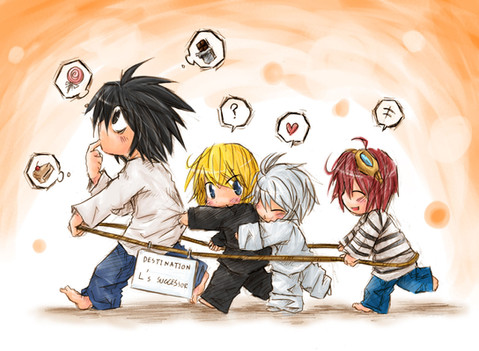 This is so cute! Whammy boys just being kids. It has a Fullmetal Alchemist feel when the characters were just children. I love that Mello has a bunch of bandaids on him.