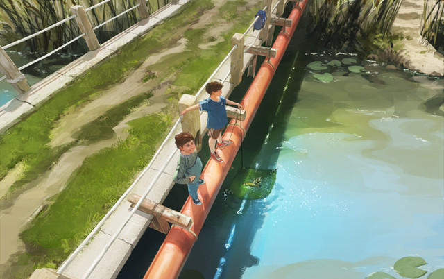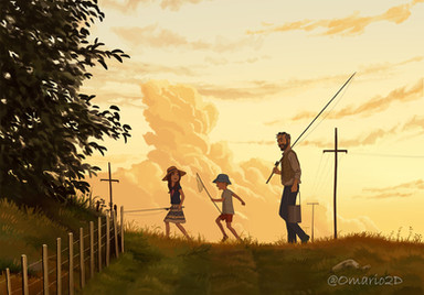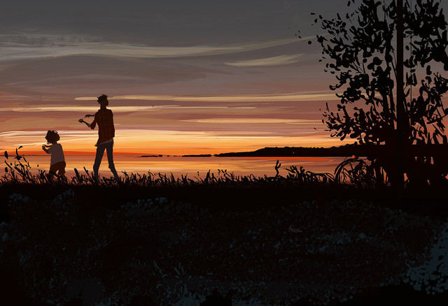A very impressionistic sky and background. And I really like the water and the reflections in it. I think that's very well done. I like the figures, too. The one on the right looks as though they are having some kind of an epiphany - standing in awe of the sky and creation - and the one on the left looks a bit sort of Huckleberry Finn-ish....