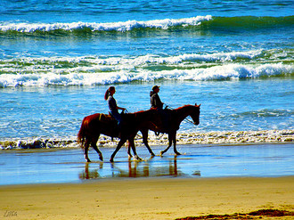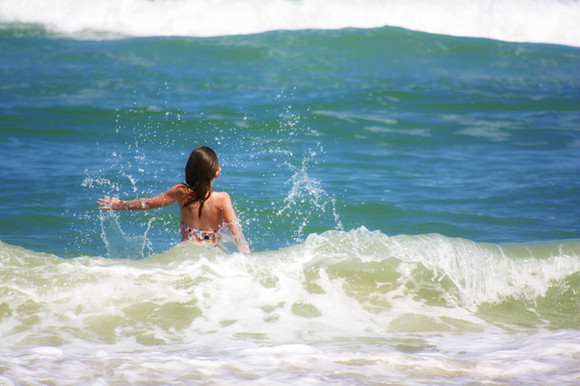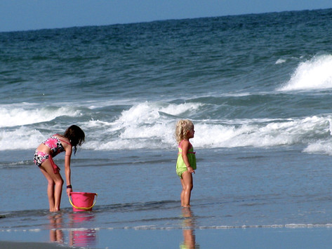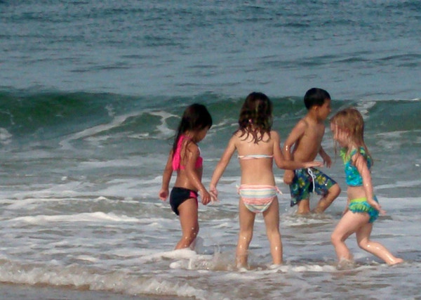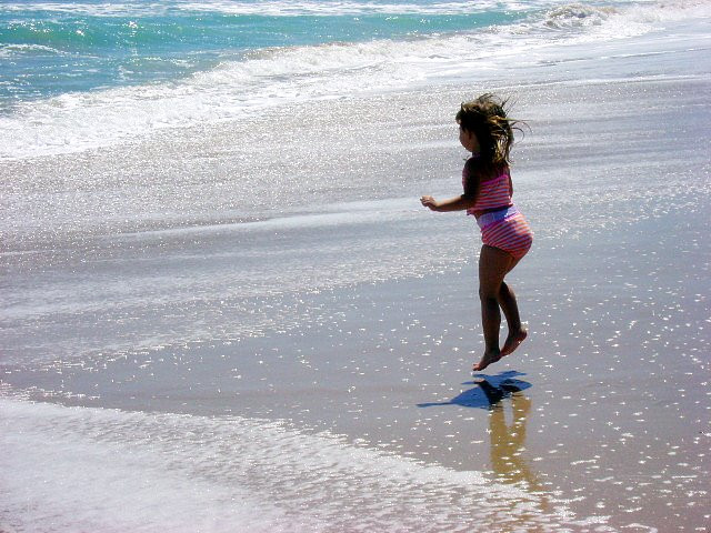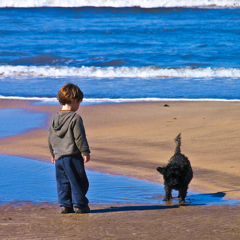 Lovely shot! Looks like the waves are running after the child to catch him/her, just for fun, and he's in a hurry to escape them!... and the dog is there to threat them and try to prevent them to go further...