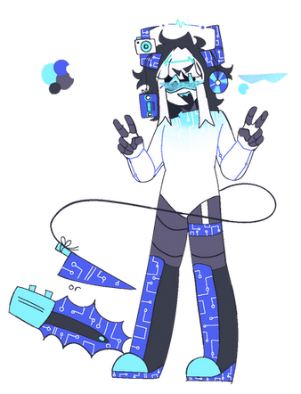 he mainly attacks with these prototype holograms and the zappies from his USB horns. however the zaps do drain his battery. when he’s below 50% the percentage will appear on his glasses, he needs to plug into something with his tail or attach a portable charger to his head to recharge. if he did reach 0% he would instantly go unconcious till he’s charged