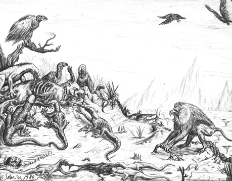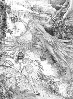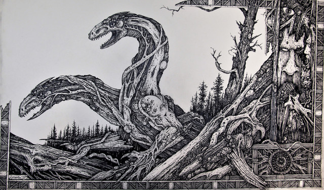 Feathered dragons fighting in an alien jungle. Ink on cartridge paper.Related content