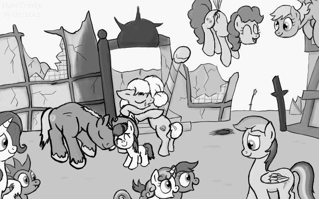 Most of them, as well as a few other Earth ponies, had gathered together unscathed. Granny Smith and Apple Bloom had gone with a small group of other Earth ponies, hoping to find refuge in other lands for as long as the fighting continued. They'd left soon after Apple Acres had been torn apart by the chaotic weather and the remaining ponies had not heard from them but hoped not to; if all was quiet then maybe the escape had gone well.