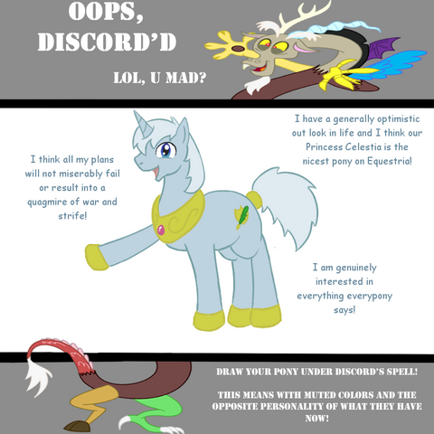 As for Discord using his power for "good instead of evil" that goes against everything we learn of him as a character in 'The Return of Harmony'. He's chaos, chaos is not evil. He MAY seem evil in the eyes of Celestia and the others because they represent Harmony, the opposite of Discord, yes, but by "reforming" him and stuff like that they are totally negating who he is and what he represents. Not to mention that he's free just as long as he keeps himself in check. Not one slip up, or BACK TO BEING A STATUE FOR YOU! ZAP! It's like he's out of prison and will be kept in check, forever, and ever, till the end of eternity! And what does he need to do to stay "free", well, just NOT BEING DISCORD all the time, forever. Sure, he can have friends, but only if he completely goes 180 degrees against his nature. And while we're on that: Why would Discord care about having a friend? He's a freaking force of nature! He should care about having friends as much as a tornado would... seriously, "Keep Calm and Flutter on" is such a bad episode in so many levels...