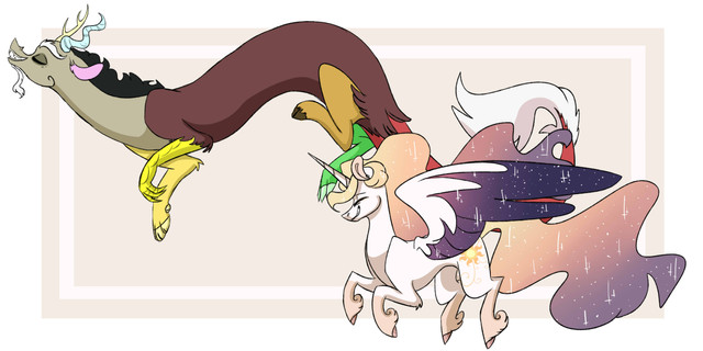 Not me being rude! "Sexual dimorphism" is the term for when two genders of the same species are significantly different from each other (which can get rather extreme). And hey, we've apparently only seen male draconequi and female alicorns.And if you don't like shipping: This doesn't actually support it. From a species point of view it looks more like Celestia and Luna came in and took Discord's territory.
