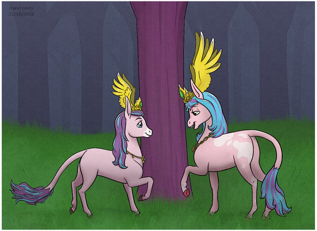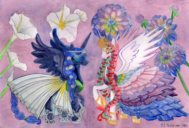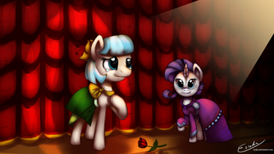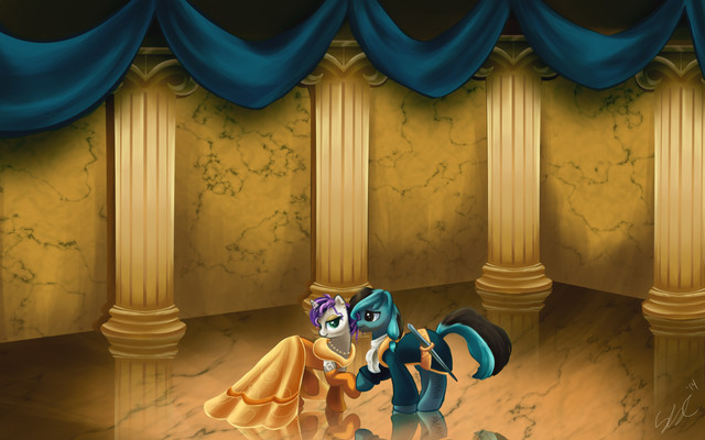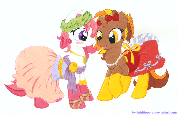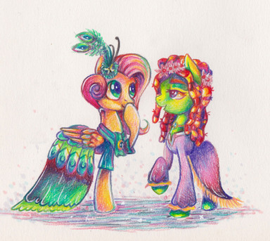 This probably explains why I tend not to draw ponies dressed up fancy for comics.Took me a while to do this because I kept drawing it, thinking "could be neater, I'll come back to it" and then not looking again for another few weeks/months. This time I figured I'd just try to balanced out the messy lines with colours/etc and TA-DA!Β