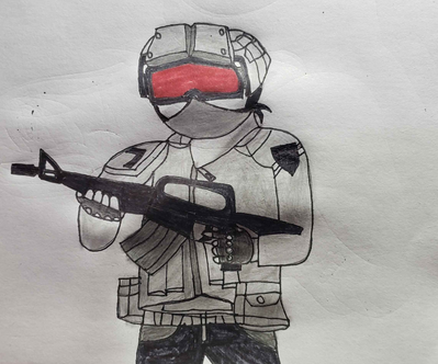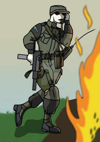 A Hashtag Corp Soldier armed with a gas operated modern version of the Thompson MP.Hashtag Corp belongs to me
