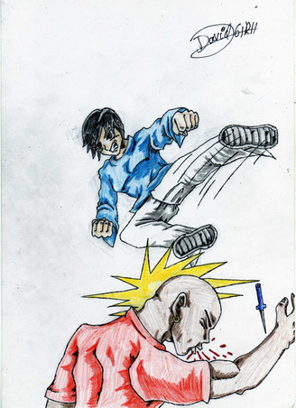 How fucking dare he smash my face into a rock!!!!....ok. My brother told me from the way he smashed my face into the rock, it would be my nose, forehead, and mouth that would most likely get fucked up. So, I tried to draw a crooked nose, a big bloody scar on my face oozing a blood all over and I forgot to add possible missing teeth... and I should've drawn blood on my shirt...