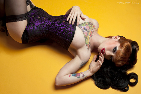 redheads and purple, my 2 favorites. I love your body art. this is a great shot, that yellow background really works well to contrast the other elements in this.