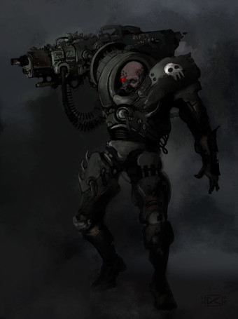 wow, very cool. Really grim and moody. Love the detail and shinyness. Reminds me of something from Games Workshop's Warhammer 40,000 world, crossed with Splinter Cell