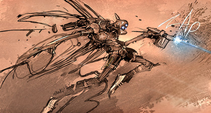 Mmm, shiny. I like the "scissors" hanging from his stomach, and the wings protruding from his back.This piece has a great value feel to it. However, there needs to be more action, more in your face feeling. Try cropping and putting him off center maybe?