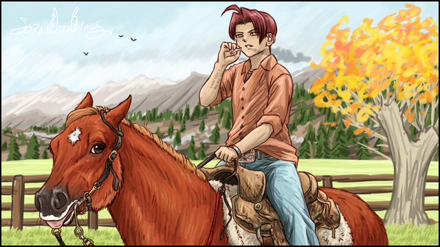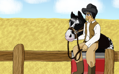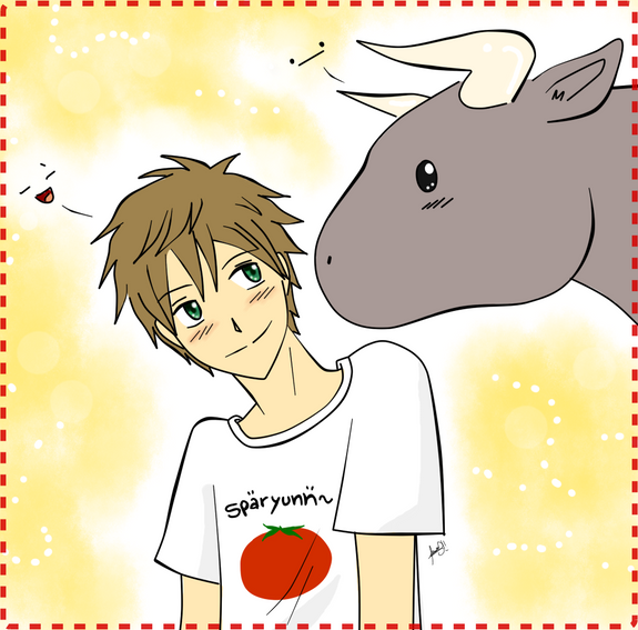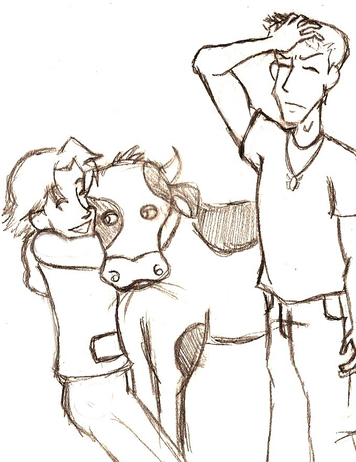 I saw that prompt thing, so why not. Gimme the badge DA. I chose the animal one, since I need to draw them more anyway. Uh, yeah. Where I'm on vacation it's in the country, so I've seen a lot of animals up close, like chickens and goats and horses. But the one animal I've wanted to see, a cow, I've only been able to see from afar. Cows have been on my mind a lot recently for that reason I guess. I can see them but I can't touch! Frustrating! I really love cows... and the way they taste! Nothing beats a good burger, right? What, were you expecting something else?It's Dan taking a photo with a cow. Despite his appearance, he's from Jersey, just like Joe. He hasn't seen many animals in person, so he's a little nervous.