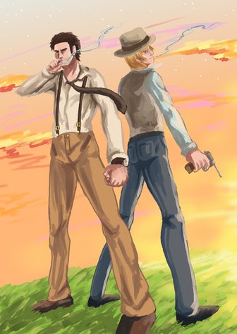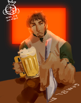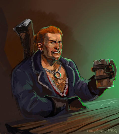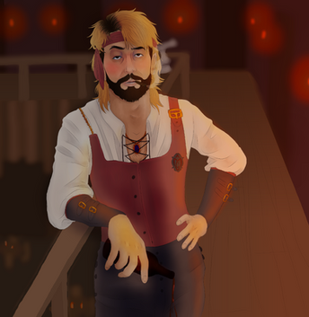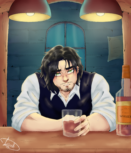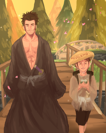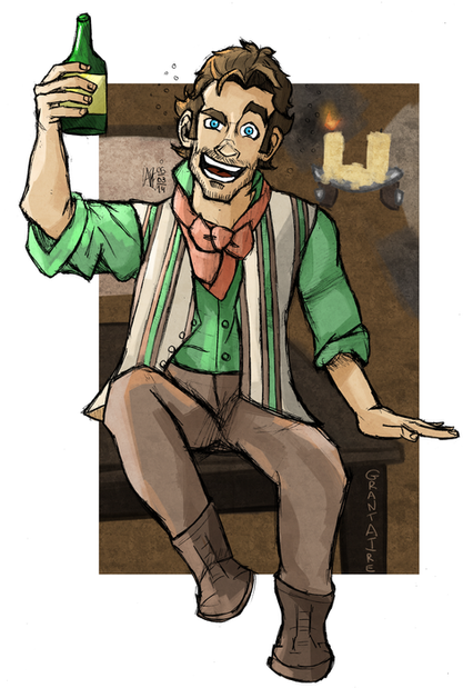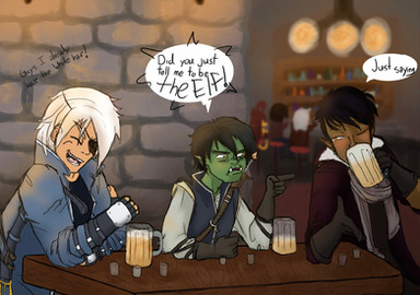 So I managed to draw more medieval stuff. Yes! One step at a time. Anyway, I decided to go for different settings as well as perspective. I usually draw the same places all the time so I'm pretty sure everyone knows what they look like already. No point in drawing it again. So, this time, I tried to draw a tavern... though it kinda looks more like a cross between a church and a pirate ship. I really need to start using references... but my pride gets in the way.It's Ethan and Gavin this time. I've been drawing Joe and Dan a lot, so I figure it's time for some other characters to get some screentime too. Gavin's asking Ethan to go on some kind of quest with him, probably monster hunting. Time to kill some slimes! I've been experimenting with the airbrush tool a little for lighting. Not bad. It sure beats making all those tiny strokes with the flat brush.