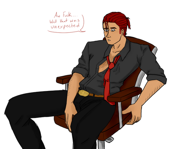 I've been coding all day, and I realized I hadn't painted anything in a while. So, I made this. I have 2 oil paintings due on Monday, still haven't started them, don't want to do them, I just want to work on game stuff... ugh. School is really becoming a chore. But I've only got a year left, so I might as well do what I can.This is a bit of a rare image. Dan's not wearing his hat, and Joe's sporting a smile. Why not do something new, right? You might be wondering about the clothing colors, well, they're just sporting their SS pride. It's a nice color combo, orange and black. I still think red and black is my fave though. Now, it's time for cringey dialogue! Yaaay.