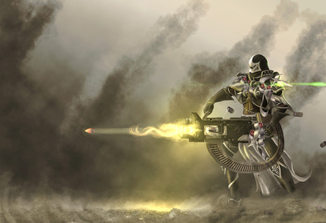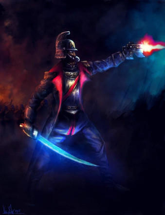 I always thought that combi-weapons were a neat, if not eccentric idea for military hardware in the setting warhammer 40k. Splendid work on illustrating your commissar in this piece, He looks like a proverbial angel of death in this one!