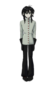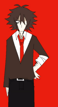Appearance: White skin with black shadows under each eye. He has straight dark brown hair. He has bright red eyes. He usually wears a white shirt and brown jeans with brown shoes. In work he wears his uniform.