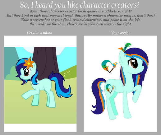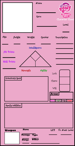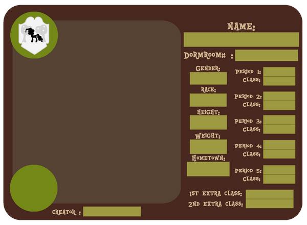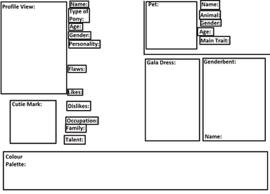 This is where you will put the picture of your character. Remember, the character must be drawn by you. It should be in MLP style, but just try your best. We understand no one will get it on there first try. Templates or tracing is not allowed. Must have flat or shaded color. Traditional art must be put in the box neatly.