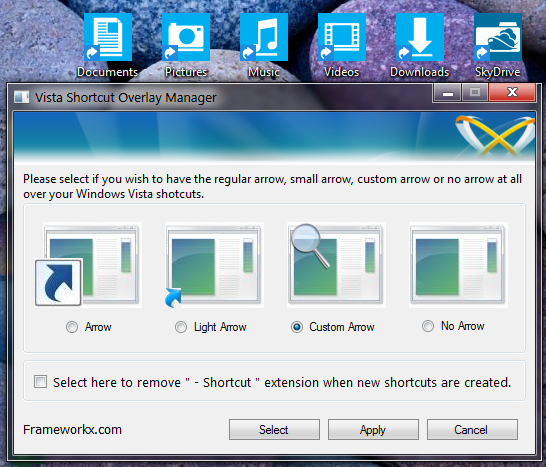 Windows Shortcut Arrow Editor allows you to remove the shortcut arrow in Windows 8, Windows 7 and Windows Vista or set it to the nice custom icon. It works properly in both x86 and x64 editions of Windows and does not require to be installed. I saw that many users want remove shortcut arrow in Windows 8, so I decide to create a tool. Also it works properly in x64 editions.Download Windows Shortcut Arrow Editor