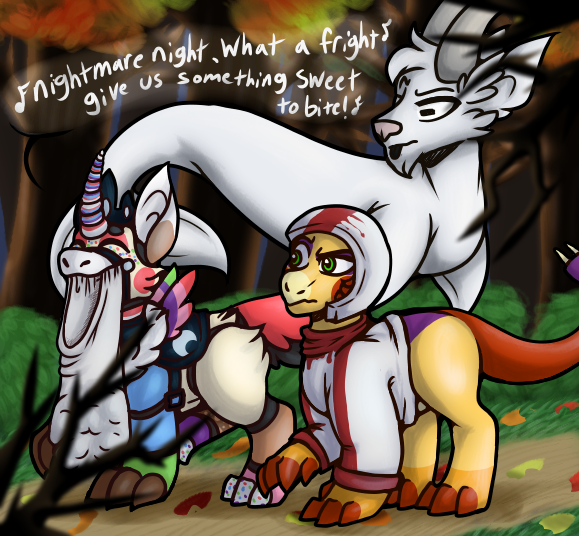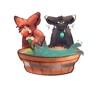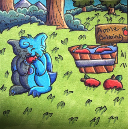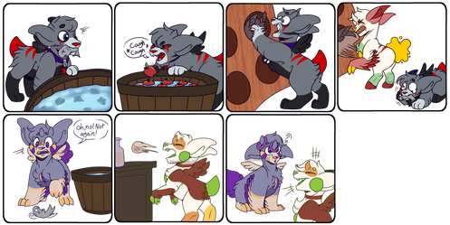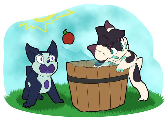 Creme is bobbing for apples, feeling very accomplished at having gotten one. Simmer, meanwhile, was about to fish, but saw a fish jump out of the tub. Now, he's panicking, retrieving the fish to put it back in before it dies. Simmer is just screaming internally at the feeling of it flopping around in his mouth. It's so gross feeling! Ugh!-----------------------------------------