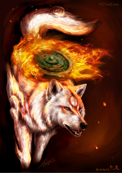 On voit combien tu as progressé au niveau des effets de poil, des ombrages, l'anatomie est vraiment bien respectée et j'aime beaucoup les couleurs qui s'en dégagent, notamment les ombres noires autour du dessin, nous focalisant sur le personnage, et celles sur le loup contrastant avec le feu émanant de son dos. En tout cas, ce dessin est magnifique, bravo !