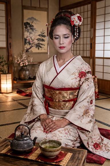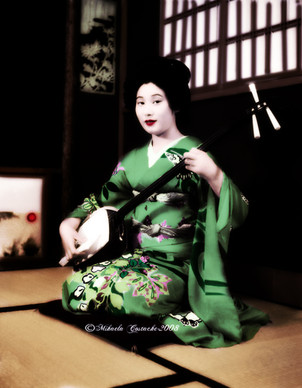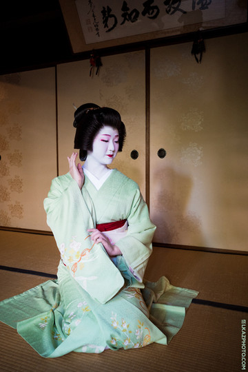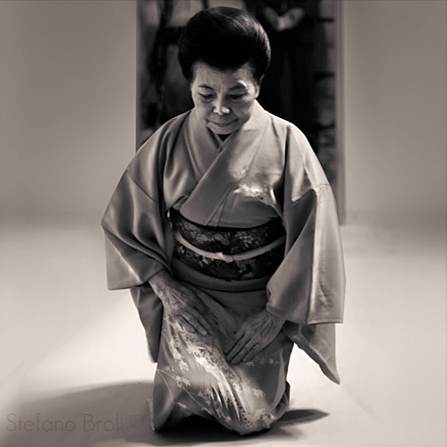 I am instantly drawn to the picture. Seeing the Chajin performing the ritualistic functions of the tea ceremony fills me with nostalgia. I like the contrast of the light and shadow, the concentration of her face and the slight tension of her body as she goes through the motions. Her kimono and accessories convey a feeling of quiet confidence, elegance and simplicity, which is reinforced by the presence of the furo, kama, hishaku and other items. This frozen snapshot of a singular moment in time is timeless in itself that but for technology looks as if it could have been taken anywhere between yesterday and a hundred years before.