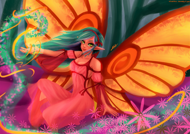I give you high praise in your colouring skills, the details of the butterfly wings, the skin and the rays of light that seep through the various colours of leaves... a true art, a masterpiece.