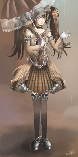 Эта работа радует больше всего моим любимым сочетанием цветов*__* Ну а если по арту то очень нравится платье, зонтик вообще отдельный разговор^___^ в общем как ни крути классная работа)))))