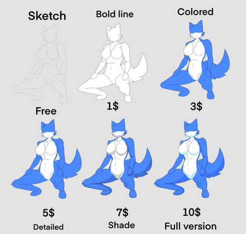 Horribly drawn, I know, but I have other things I need to do right now and someone needed a reference of what I could do so here's the four main types I offer for drawing and prices.Prices include a background whether you want a full background or a simple color background, simple color background has a $2 discount.