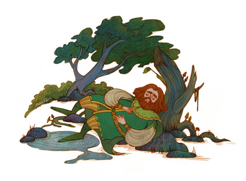 Thor doesn't look very comfortable sitting in the splits, trying to sleep with Loki sitting on his head. Loki doesn't look happy about it either, considering he's squished in a corner. Knowing him, he will find a way to trick Thjalfi and Roskva out of the good sleeping spot.