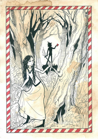 Norse mythology: The kidnap of Idunn and her apples.There are Loki and Idunn and Thjazir the giant in his bird disguise. Bragi, IdunnΒ΄s husband is sitting under the apple tree.