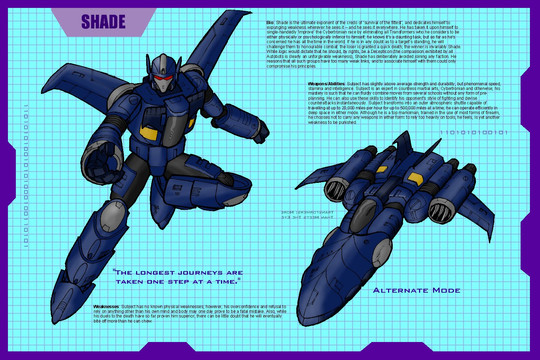 Another quick and dirty re-colouring of some old line art.This is a bit of a G2 amalgamation. His colour scheme is based on the G2 Ramjet toy's scheme. His name is actually what G2 Dreadwing called in Europe. His motto belonged to Stealth Assault (which is what G2 Dreadwing was released as in the UK). His bio is based on the Botcon G2 Ramjet's bio.